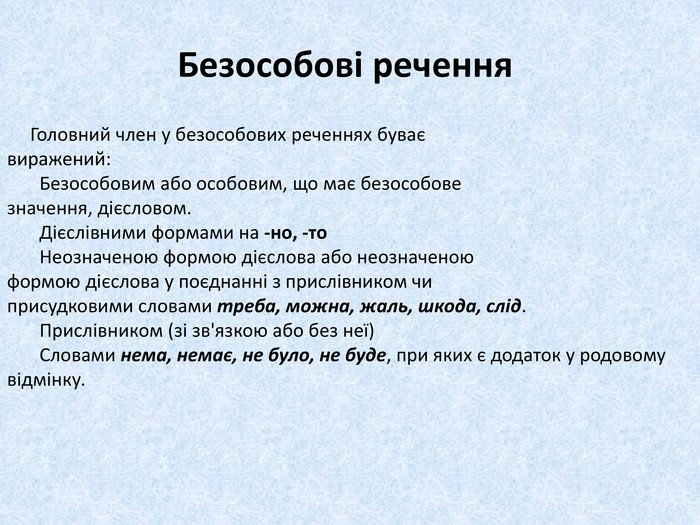 - Присудок у формі безособових дієслів, інфінітива або у формі третьої особи однини.