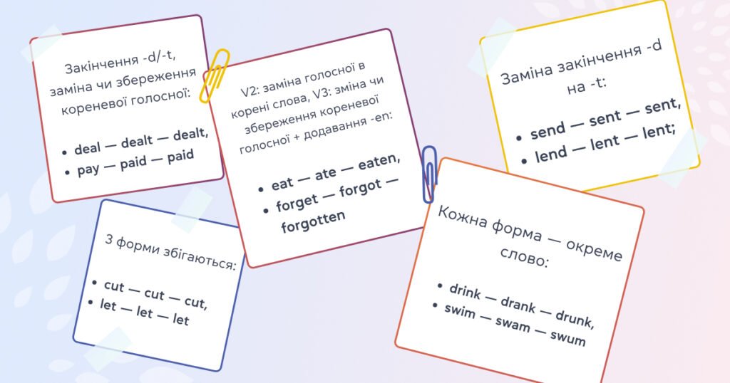 - Зміна приголосних: send – sent – sent, build – built – built.